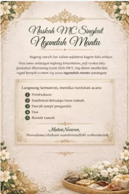 NASKAH MC SINGKAT – NGUNDUH MANTU Assalamu’alaikum warahmatullahi wabarakatuh. Sugeng rawuh lan salam sejahtera kagem kita sedaya. Para tamu undangan ingkang kinurmatan, puji syukur kita panjatkan dhumateng Gusti Allah SWT. ...