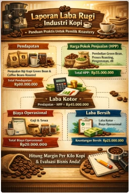 Roastery yang sehat bukan hanya menghasilkan kopi berkualitas, tapi juga memiliki laporan keuangan yang rapi. Dengan laporan laba rugi yang jelas, pemilik roastery bisa menentukan harga jual yang tepat, menjaga margin, dan mengembangkan bisnis secara berkelanjutan.