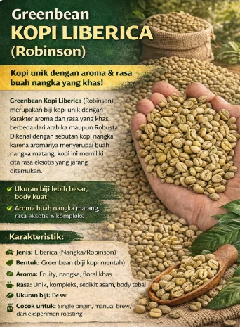 Greenbean Kopi Liberica (Nangka / Robinson) merupakan biji kopi unik dengan karakter aroma dan rasa yang khas, berbeda dari arabika maupun Robusta. Dikenal dengan sebutan kopi nangka karena aromanya yang buahnya menyerupai buah nangka matang, kopi ini memiliki cita rasa eksotis yang jarang ditemukan.
