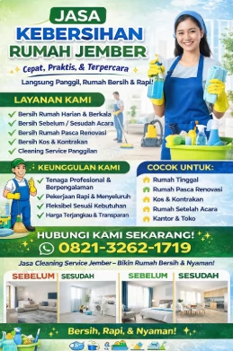 Jasa cleaning service Jember atau bersih rumah, kantor, dan apartemen lengkap dengan berbagai layanan. Lengkap, mudah, murah, dan profesional! WA 082132621719