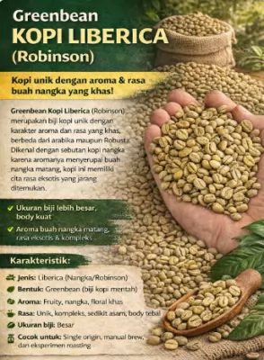 Greenbean Kopi Liberica (Nangka / Robinson) merupakan biji kopi unik dengan karakter aroma dan rasa yang khas, berbeda dari arabika maupun Robusta. Dikenal dengan sebutan kopi nangka karena aromanya yang buahnya menyerupai buah ...