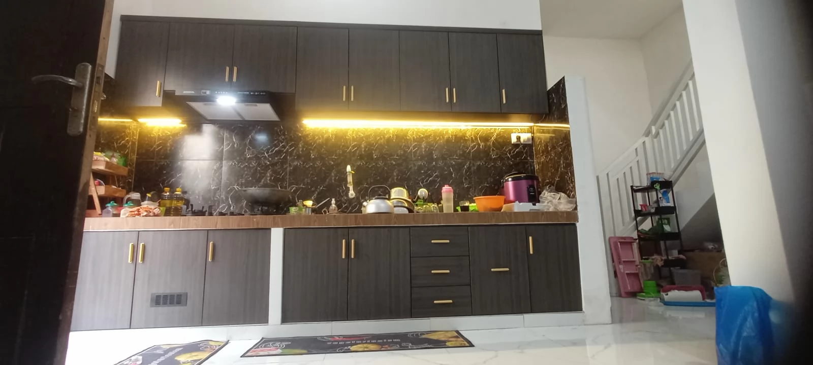 Dilengkapi dengan lemari atas dan bawah yang luas, sistem penyimpanan tertata rapi, serta desain ergonomis yang nyaman digunakan untuk aktivitas memasak sehari-hari. Cocok untuk rumah tinggal, apartemen, maupun hunian bertingkat dengan konsep modern.