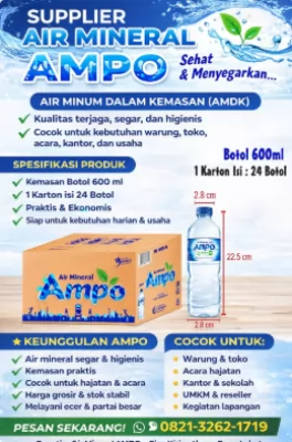 Kami adalah supplier air mineral AMPO yang menyediakan air minum dalam kemasan (AMDK) berkualitas untuk kebutuhan warung, toko, acara, kantor, dan usaha. Produk Air Mineral AMPO dikemas dalam botol 600 ml, dengan 1 karton ...
