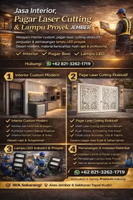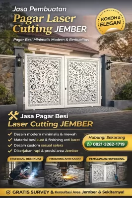 Kami melayani jasa pembuatan pagar laser cutting di Jember dengan desain minimalis modern , kuat, dan elegan. Pagar dibuat menggunakan material besi berkualitas , dikerjakan secara presisi , serta dilengkapi finishing anti karat agar tahan ...