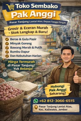 Toko Sembako Pak Anggi adalah toko sembako lengkap yang berlokasi di Pasar Tanjung Jember lantai bawah, Kecamatan Kaliwates. Kami melayani pembelian eceran dan grosir untuk kebutuhan rumah tangga, warung, pedagang, dan UMKM. ...