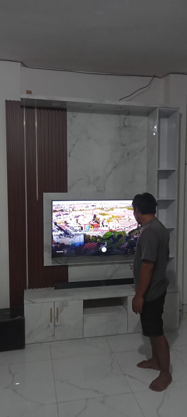 Wall panel TV custom dengan desain modern minimalis , sentuhan motif marmer premium , dan pencahayaan LED eksklusif seperti pada gambar.